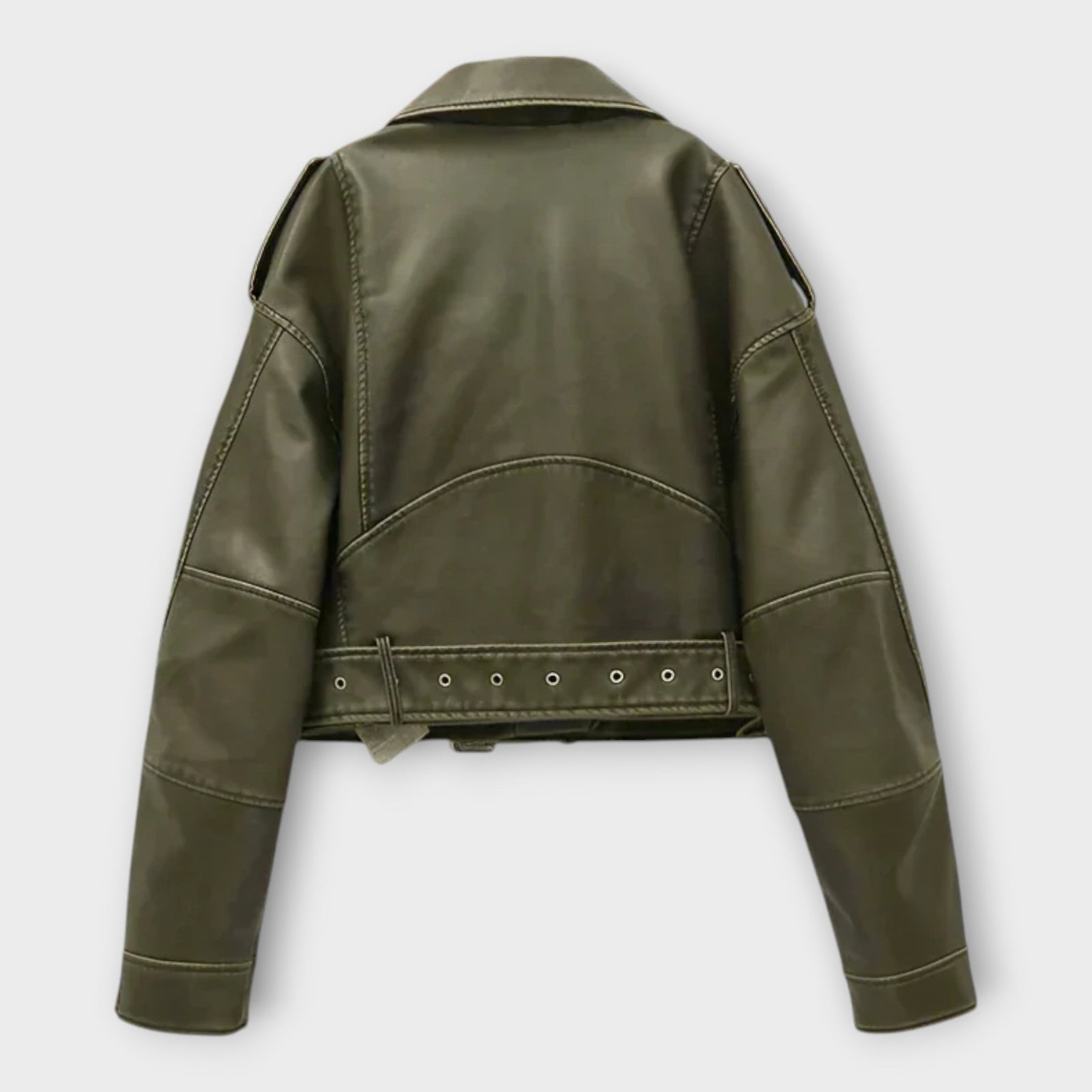 Zsuzsa - Modern Rövid Bőrkabát Övvel és Finom Esztétikával