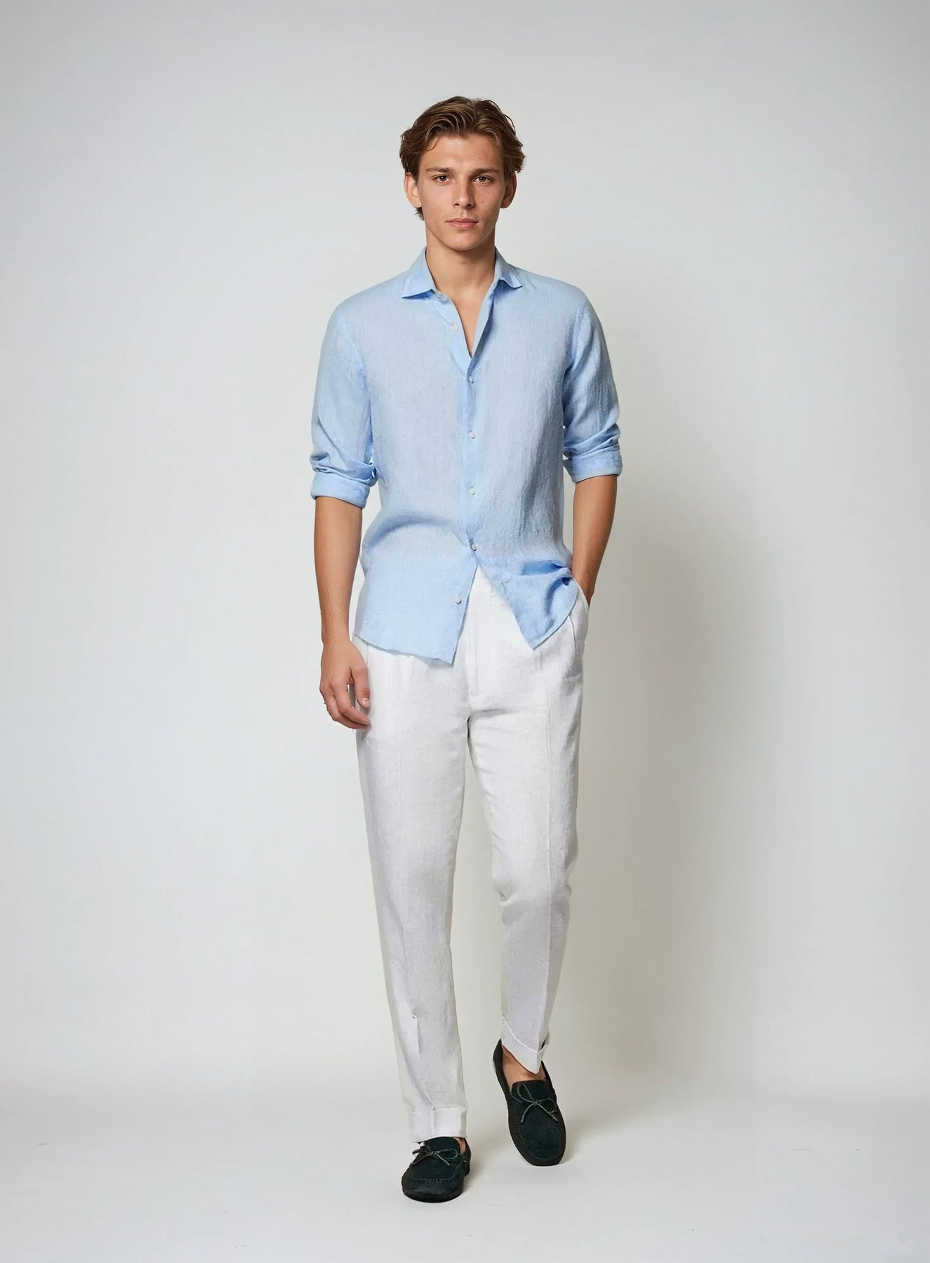 Fedezze fel a Grand Arbre világoskék len ingjének kifinomult stílusát. Ez az elegáns ing a len lélegző tulajdonságait ötvözi a friss, lágy világoskék színnel, amely ideális a stílusos és kényelmes ruhadarabot kereső férfiak számára, mind a hétköznapi, mind a félformális eseményekhez.