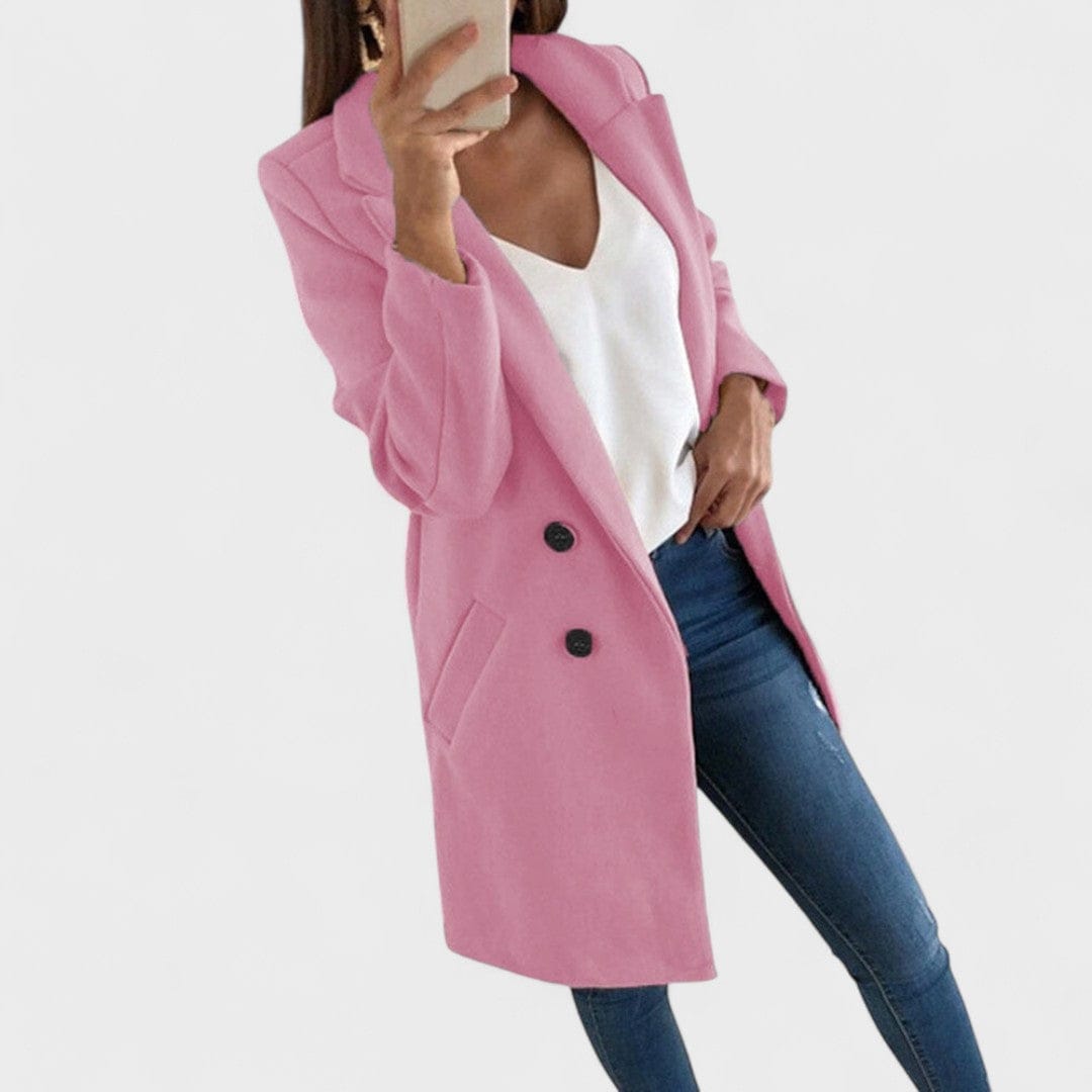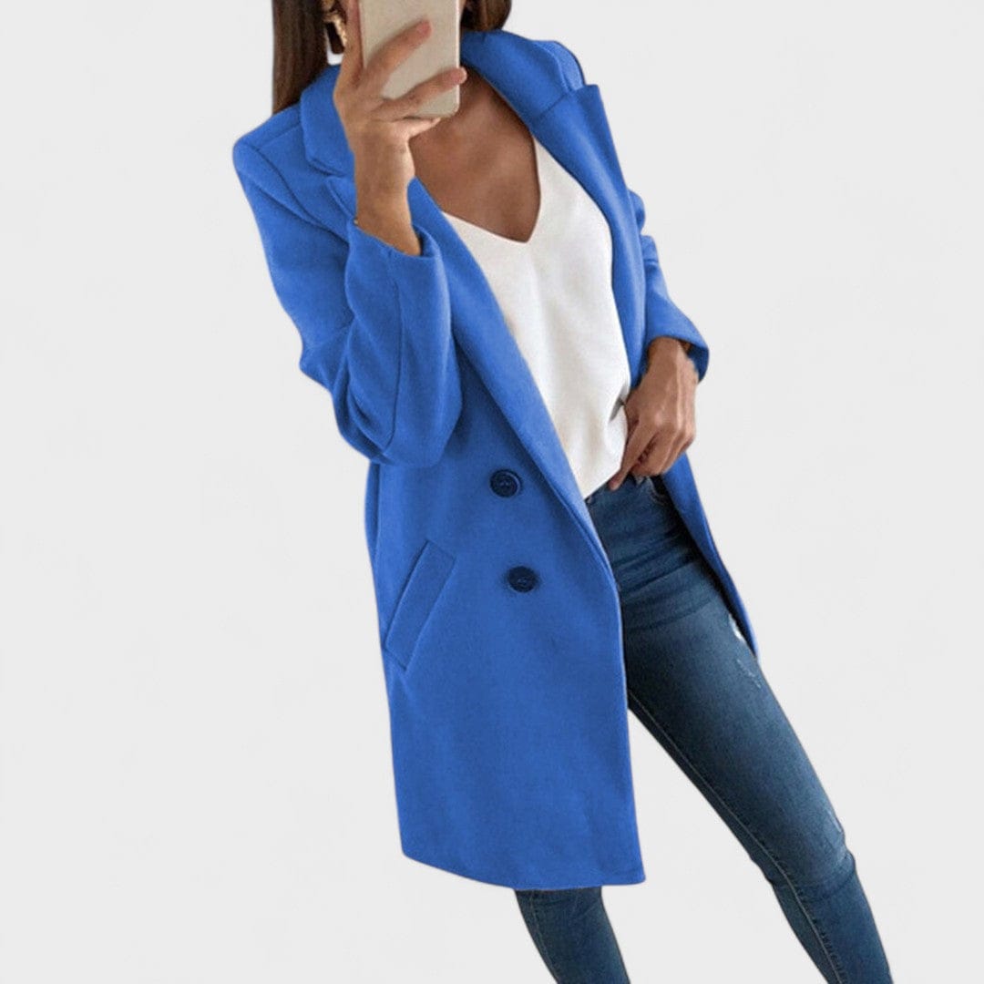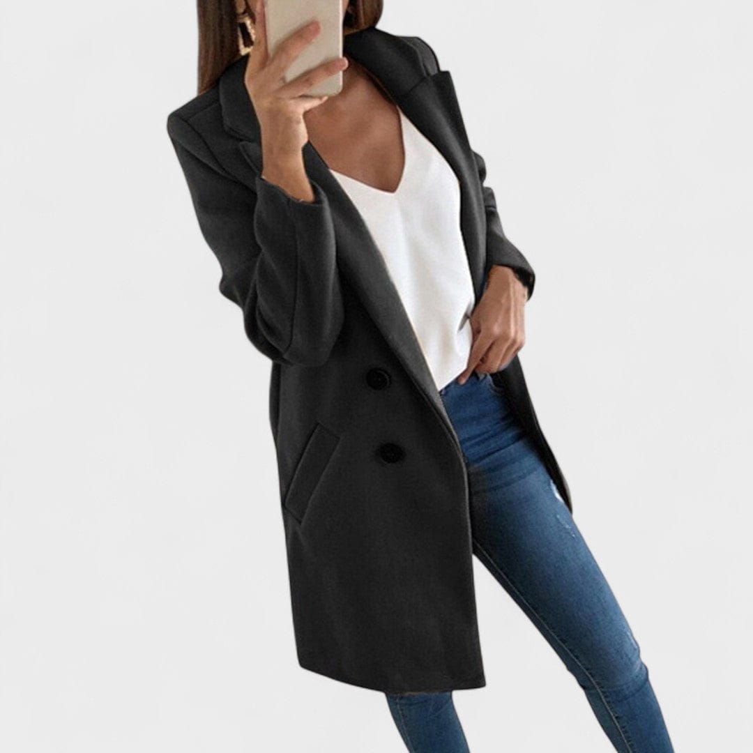 • Előnyös szabás – tiszta vonalak, reverek és olyan hossz, amely vizuálisan nyújtja az alakot.
