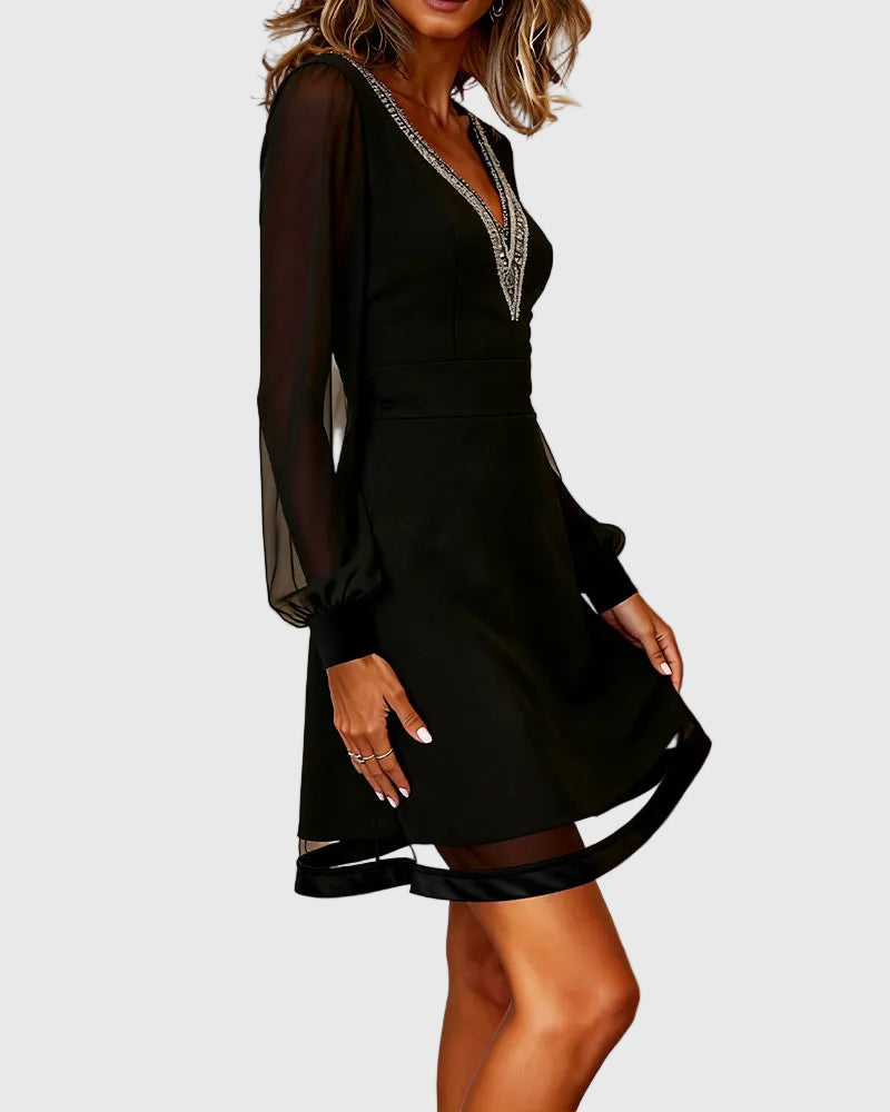 Elegáns, nőies és kifinomultan könnyed — ez a karcsúsító ruha úgy lett megalkotva, hogy magabiztosságot adjon minden lépésnél. A V-nyakkivágás finoman mélyen a dekoltázst, míg a gondosan elhelyezett betétek és az enyhén lebegő ujjak karcsú, harmonikus sziluettet formálnak. Tökéletes választás különleges alkalmakra, vacsorákra vagy elegáns esti megjelenésekhez.