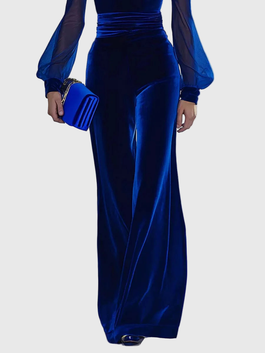 Lépj be a kifinomult stílus világába ezzel a bársonyos overállal, amely mély V-nyakkivágással és áttetsző sifon ujjal. A drapírozott derékrész kiemeli a derékvonalat, míg a széles szár eleganciát kölcsönöz a sziluettnek. Tökéletes választás vacsorákhoz, esti rendezvényekhez és év végi bulikhoz – stílusos és magabiztos megjelenést biztosít minden alkalommal.
