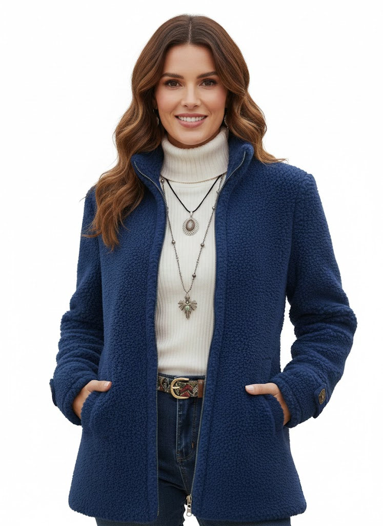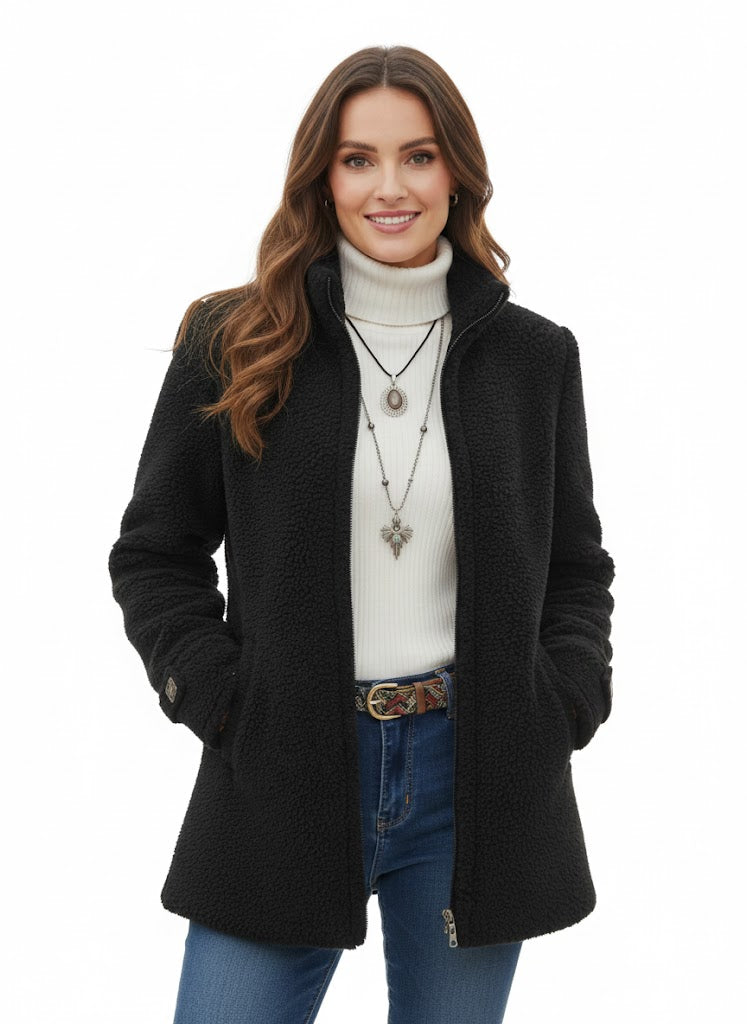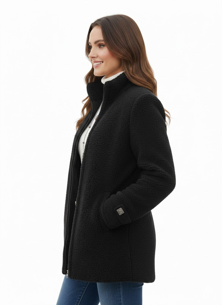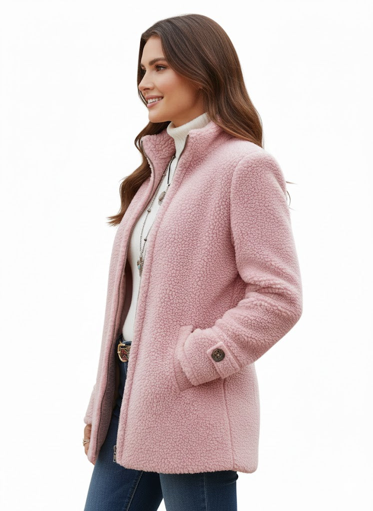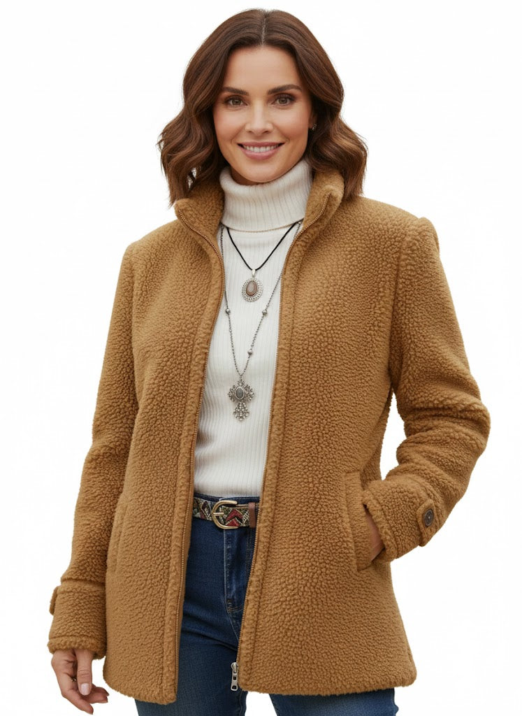 A Chanelle dzseki olyan nők számára készült, akik kényelmes meleget szeretnének anélkül, hogy túl vastagnak vagy túlöltözöttnek éreznék magukat. Puha báránygyapjú tapintású anyaga és a csípő alatt végződő laza fazonja vonzó, könnyed siluettet teremt, amelyre napról napra támaszkodhat. A tiszta teljes cipzáras elülső rész és az állógallér kifinomult érintést ad, így ez a dzseki tökéletes a napi teendőkhöz, utazáshoz vagy laza kiruccanásokhoz.