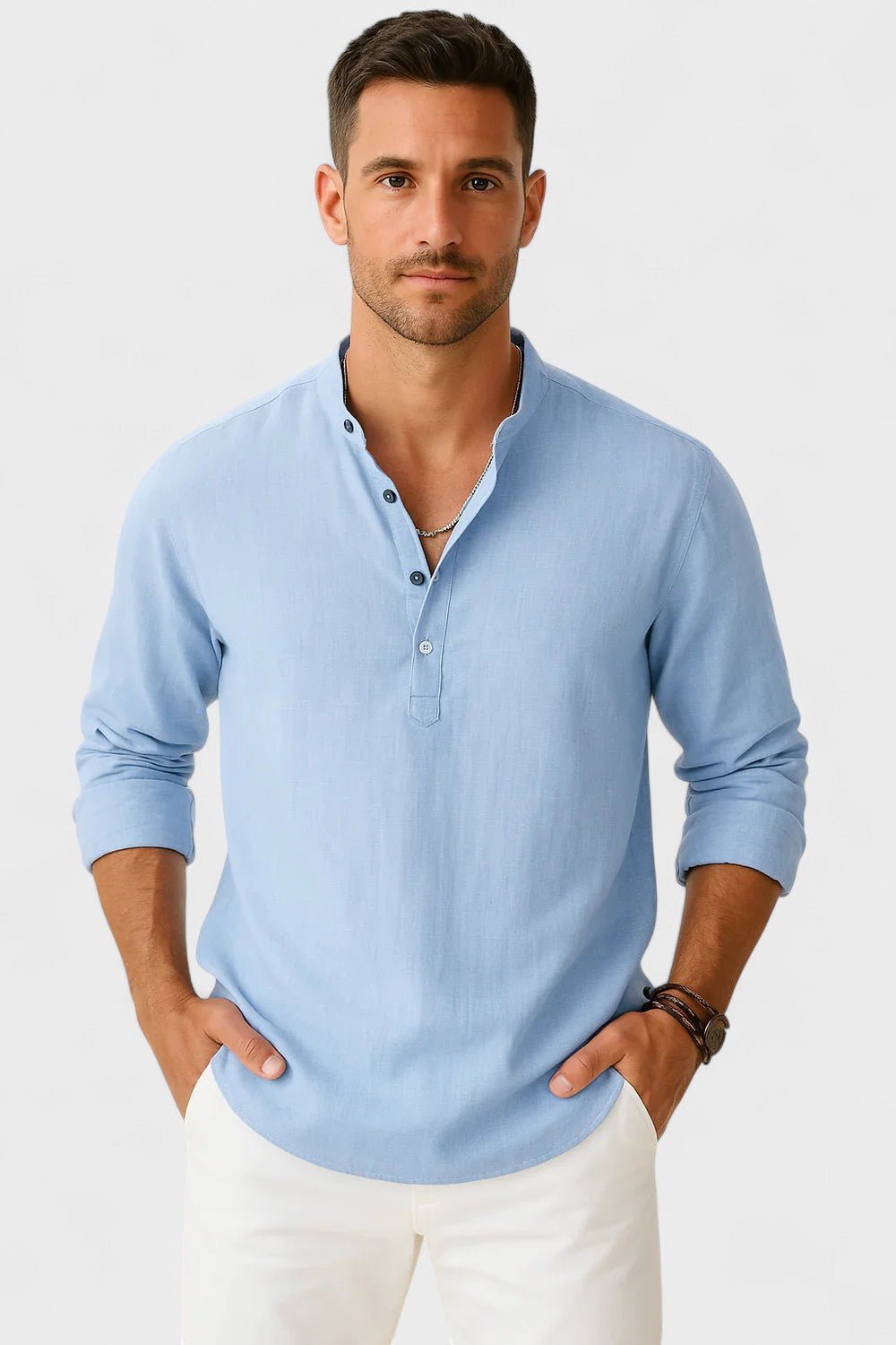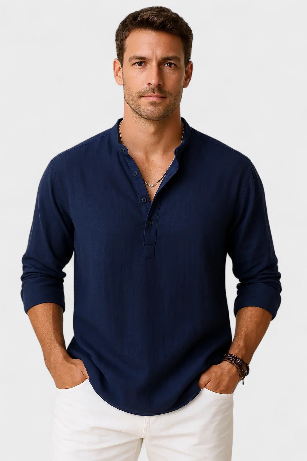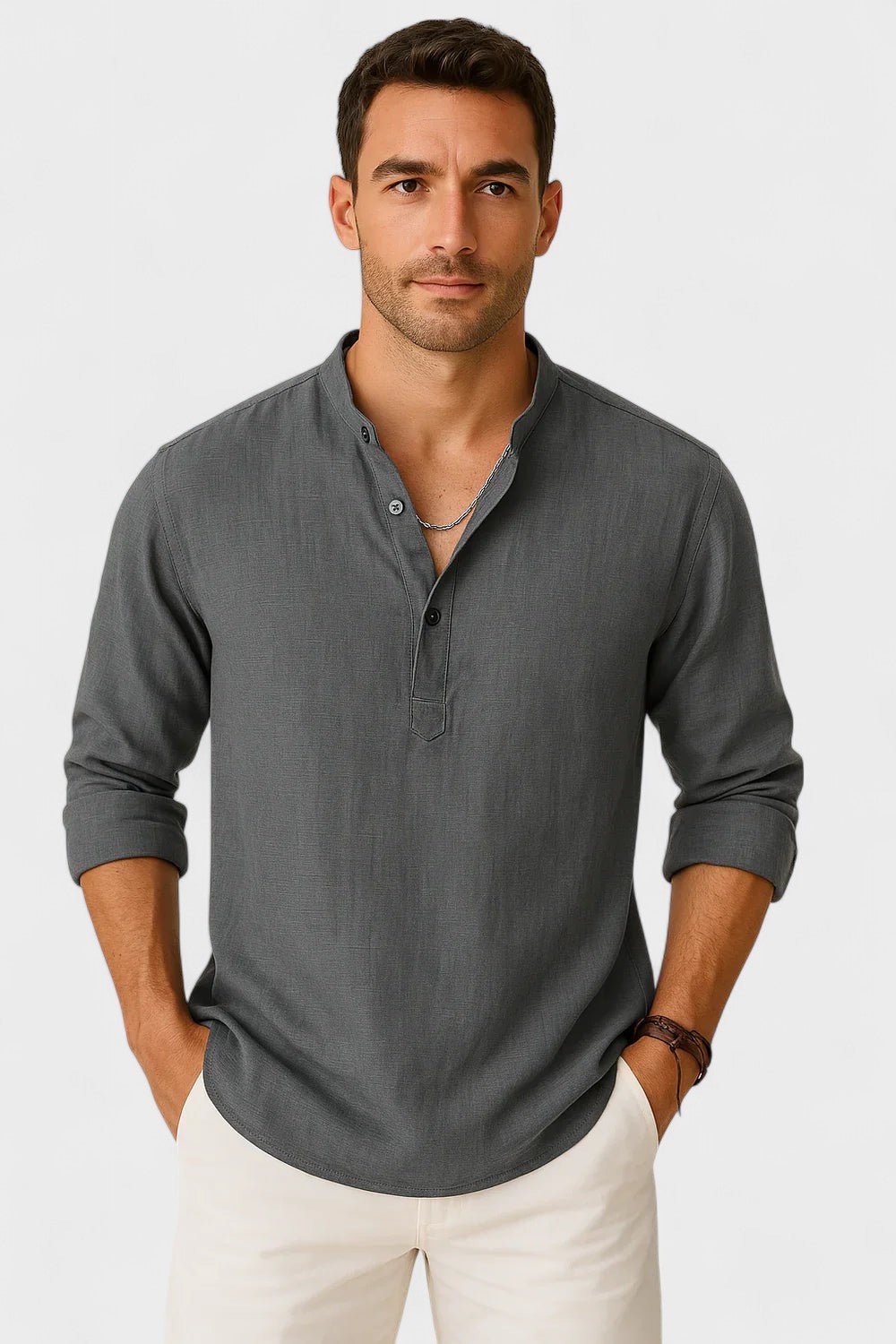 Tapasztalja meg a tökéletes egyensúlyt a kifinomultság és a lazaság között ezzel a hosszú ujjú inggel, mandarin gallérral. Könnyű, légies anyagból készült, így ideális azok számára, akik modern megjelenést szeretnének, anélkül, hogy a kényelemről lemondanának. A szűk fazon hangsúlyozza a férfiak sziluettjét, míg a minimalista részletek stílust és jó ízlést sugároznak minden alkalomra – a sétától a különleges vacsoráig.