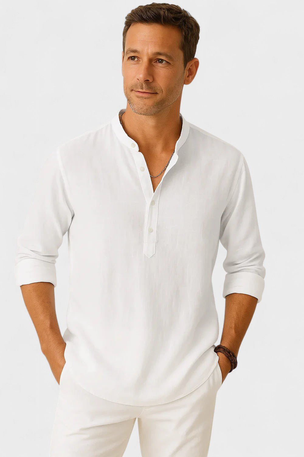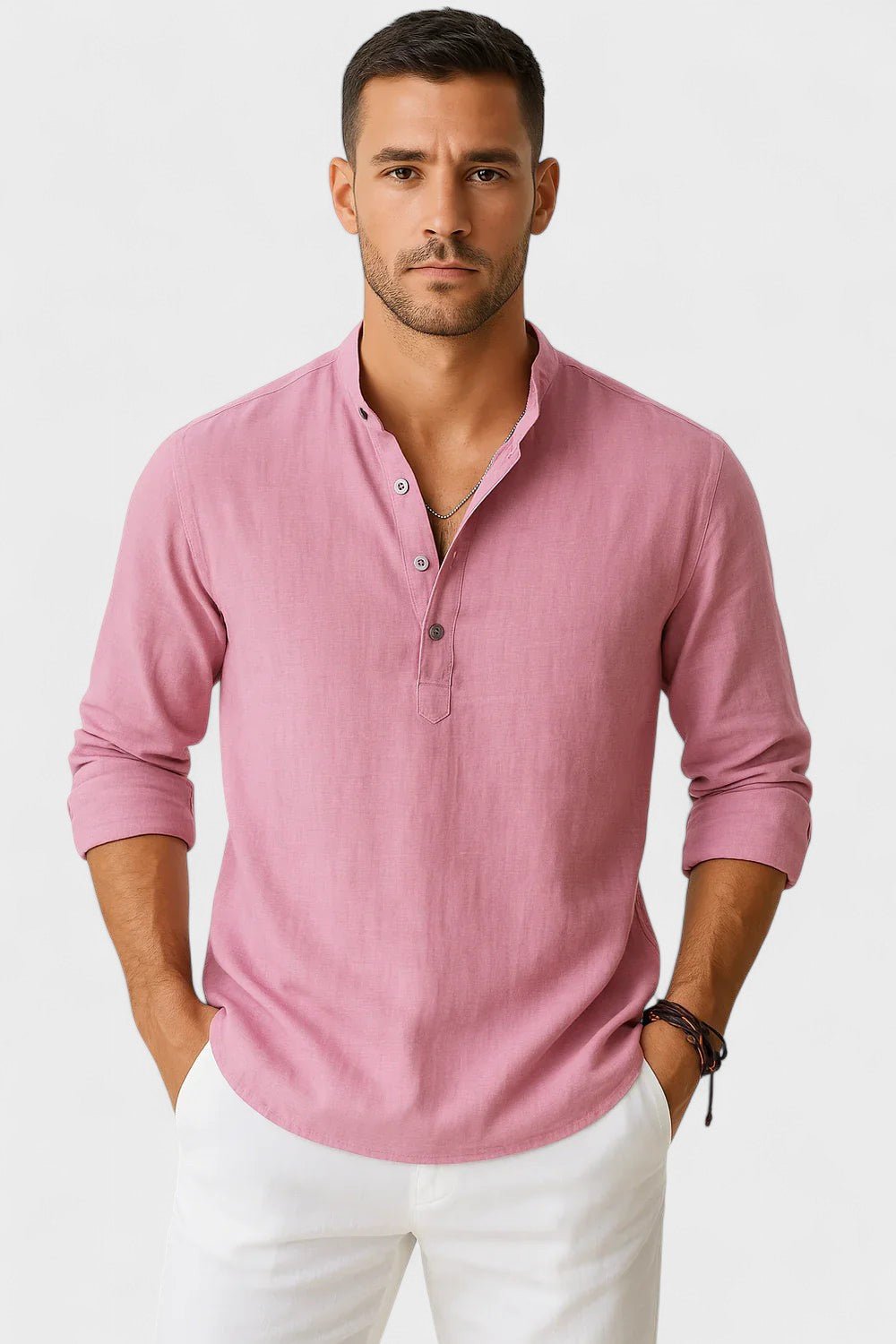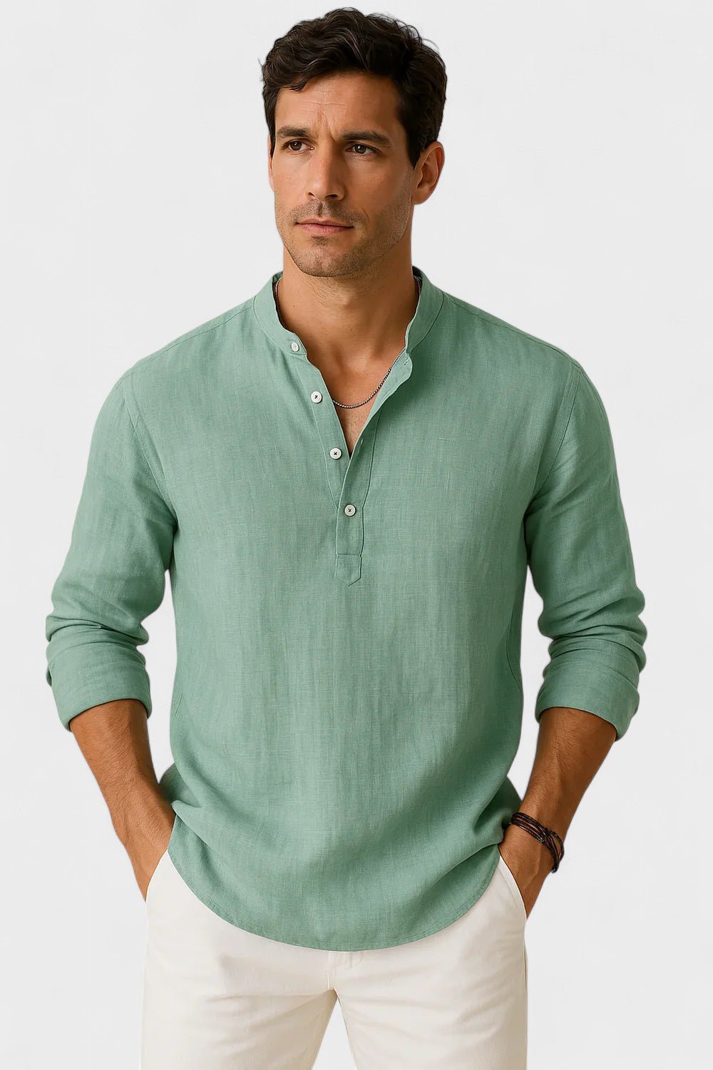 Tapasztalja meg a tökéletes egyensúlyt a kifinomultság és a lazaság között ezzel a hosszú ujjú inggel, mandarin gallérral. Könnyű, légies anyagból készült, így ideális azok számára, akik modern megjelenést szeretnének, anélkül, hogy a kényelemről lemondanának. A szűk fazon hangsúlyozza a férfiak sziluettjét, míg a minimalista részletek stílust és jó ízlést sugároznak minden alkalomra – a sétától a különleges vacsoráig.