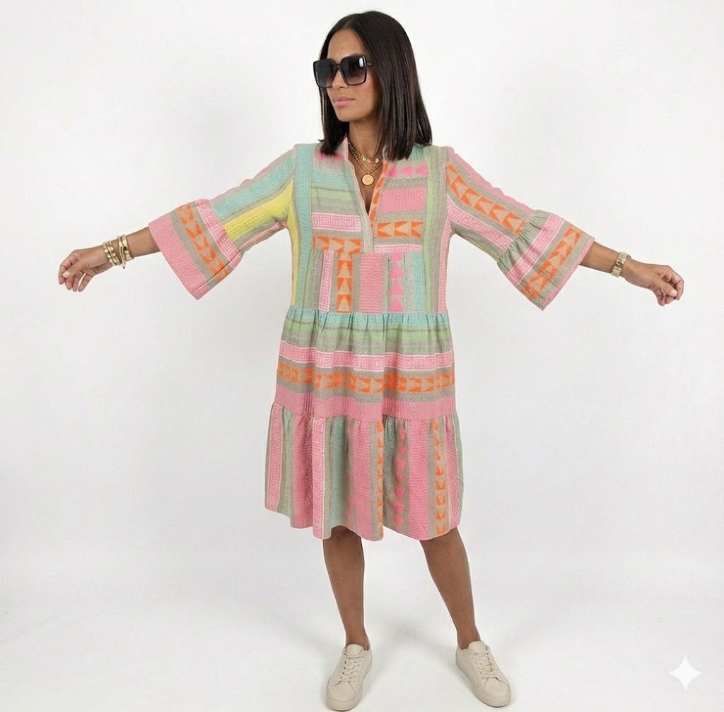 Lágy sziluettje, élénk geometrikus mintái és puha szerkezete olyan megjelenést kölcsönöz, amely kifejező, mégis gondtalan — tökéletes napokra, amikor a kényelmet keresed anélkül, hogy a stílust feláldoznád.