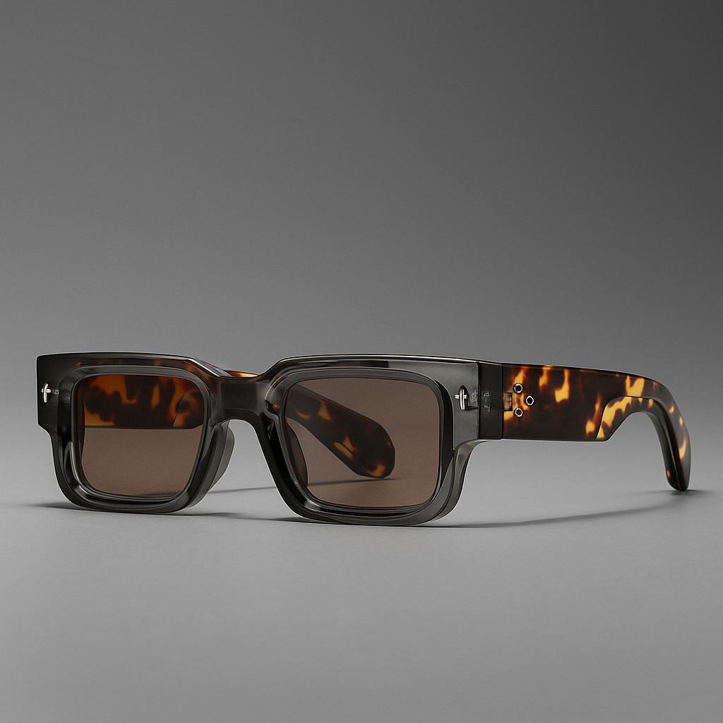 A merész téglalap alakú kivágással és rétegezett acetát kerettel készült ez a pár, amely megjelenésével dominál anélkül, hogy túlbonyolítaná a stílust. A vastag szárak teknősbéka mintázatúak, ami extra mélységet ad, míg a tónusos lencsék tiszta védelmet nyújtanak vintage hatással.